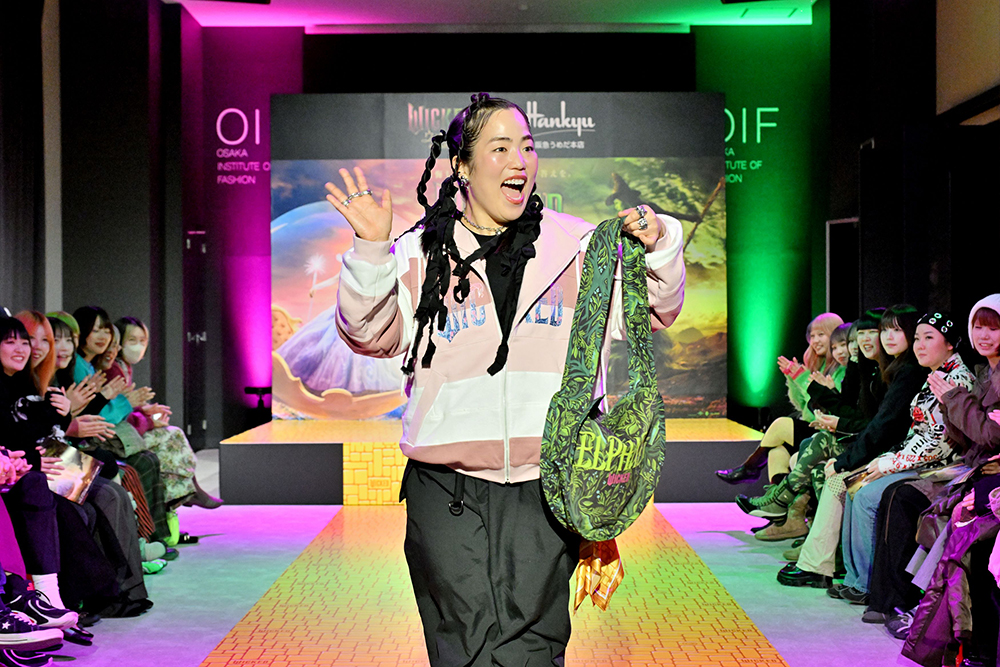 学生がデザイン・制作した、グリンダをイメージした大胆な刺繍と個性あふれるフードデザインが注目のジップパーカーを身につけ、“黄色いレンガの道”のランウェイを堂々と歩く姿に、会場は一気に最高潮の盛り上がりを見せました。